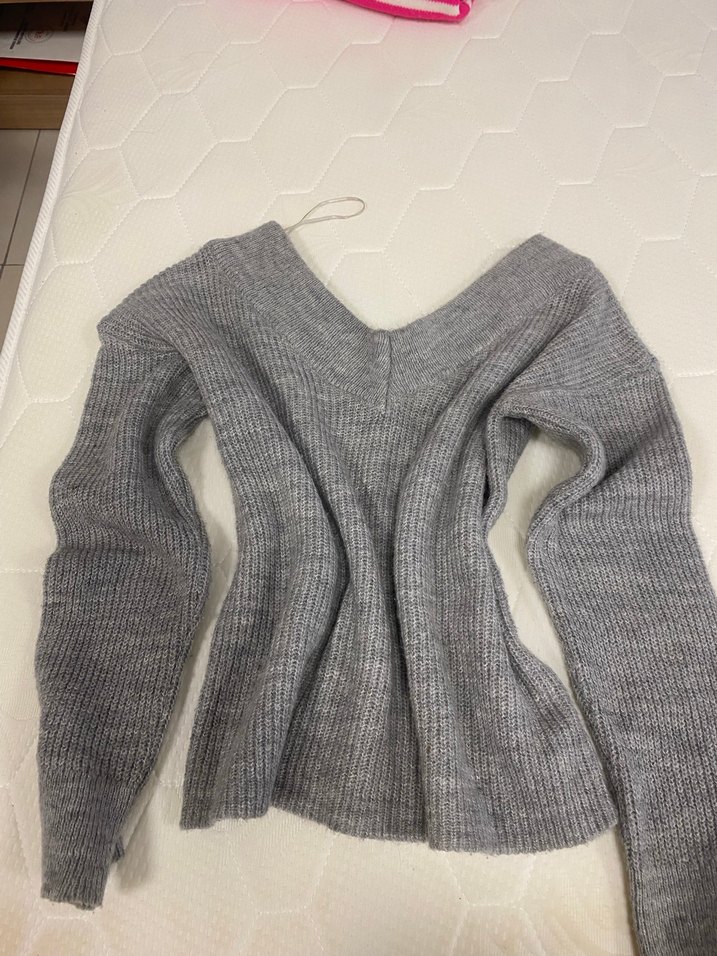 Gri renkte, V yaka ve uzun kollu, vücuda oturan kadın kazak. Yumuşak triko dokusu ve normal midi boyuyla rahat sokak tarzına uygundur.