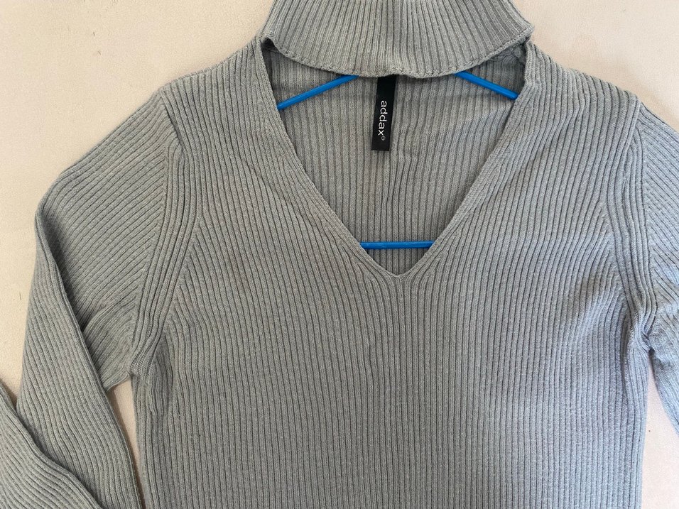 Gri renkte, V yaka ve uzun kollu, triko dokulu, sentetik kumaştan yapılmış, vücuda oturan kadın kazak. Rahat ve günlük kullanıma uygun.