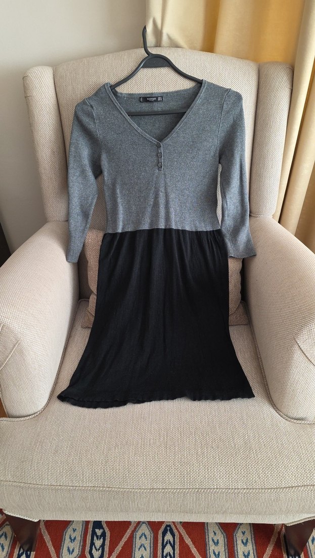 Gri triko üstü V yakalı ve fakir kollu, altı siyah vücuda oturan midi elbise. Günlük kullanıma uygun rahat tasarım. Koltuk altı 35 cm, beli 35 cm, kol boyu 43 cm ve boyu 85 cm, coton ve polyester sanırım