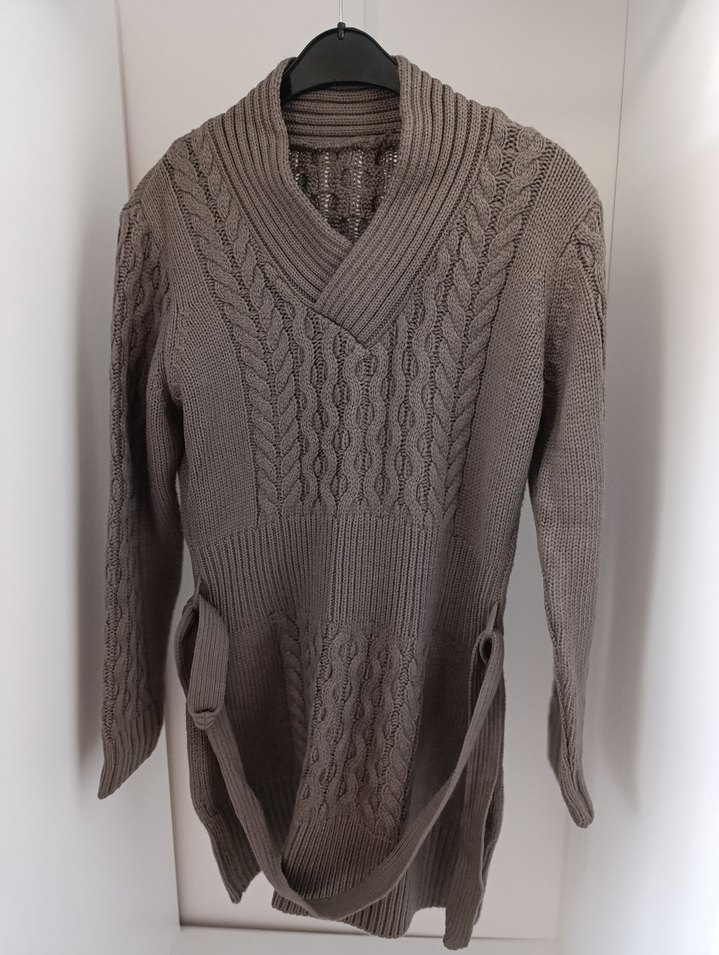 Gri renkte, V yakalı ve uzun kollu, triko kumaştan yapılmış, midi uzunlukta, beli kuşaklı ve vücuda oturan kadın kazak.