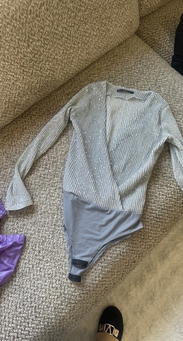 V yaka, triko dokulu, gri uzun kollu ve vücuda oturan bluz body. Sokak modası ve partiler için uygun.