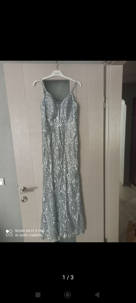 V yaka, kolsuz, drapeli, yılan desenli gri uzun abiye elbise. Şık ve fit kesimiyle düğün gibi özel anlara uygundur. 36 beden