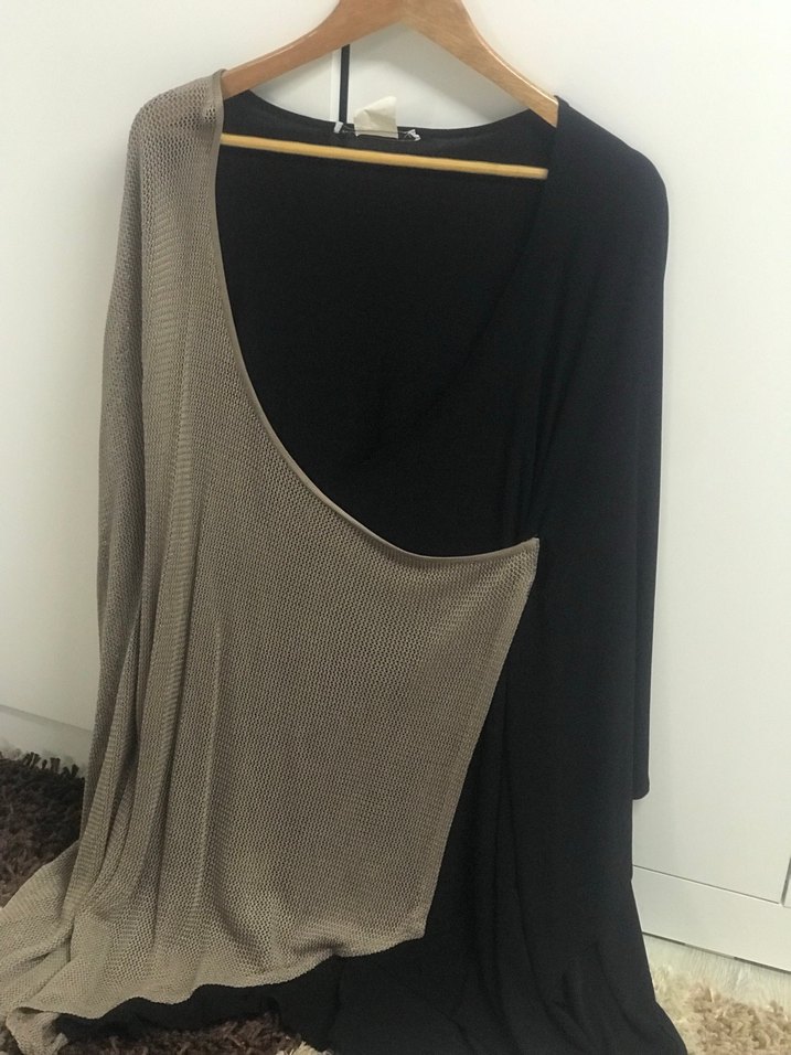 Gri ve siyah renkte, V yakalı, uzun kollu, dökümlü ve bol kesim hamile tunik. Günlük kullanım için uygun, konforlu sentetik kumaştan üretilmiştir.