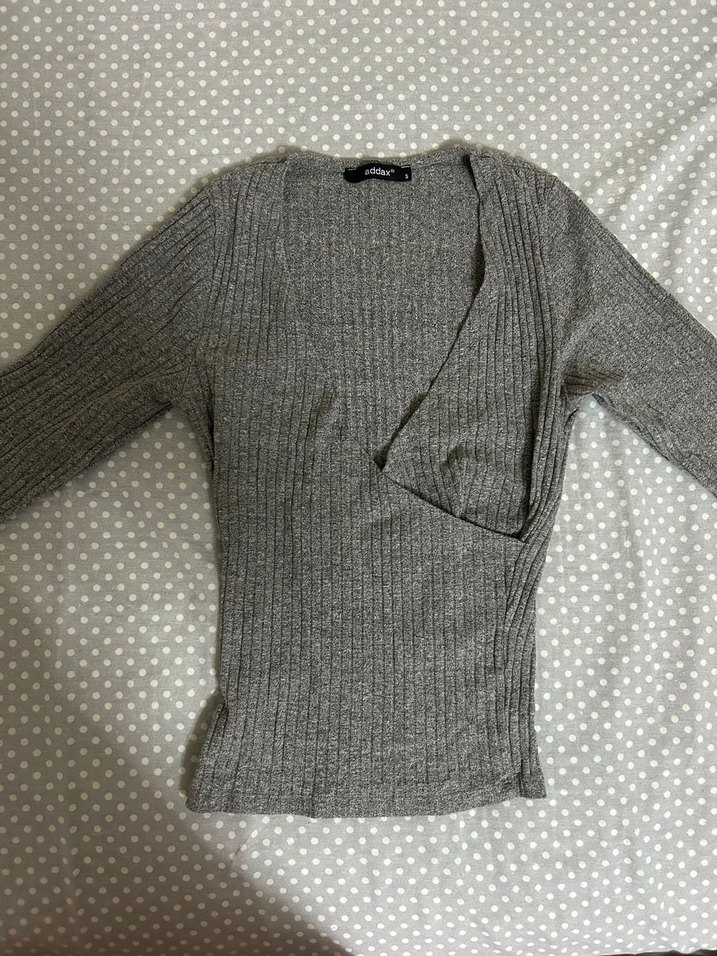 Gri renkte, V yaka ve uzun kollu, ince örme kumaştan yapılmış, rahat ve trend bir günlük kullanıma uygun kazak.