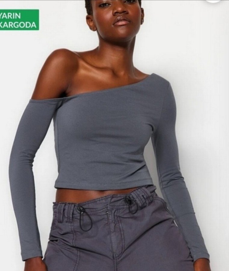 Gri renkli, V yakalı ve uzun kollu, denim kumaştan yapılmış, sade ve şık kesimli kadın bluz. Midi boyda ve günlük rahat kullanıma uygun.