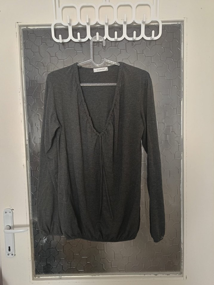 Gri renkte, V yakalı ve uzun kollu kazağıdır. Rahat kesimi ve yumuşak keten kumaşıyla günlük kullanım için uygundur. Midi boyu ve desensiz tasarımıyla şık ve rahat bir seçenek sunar.
