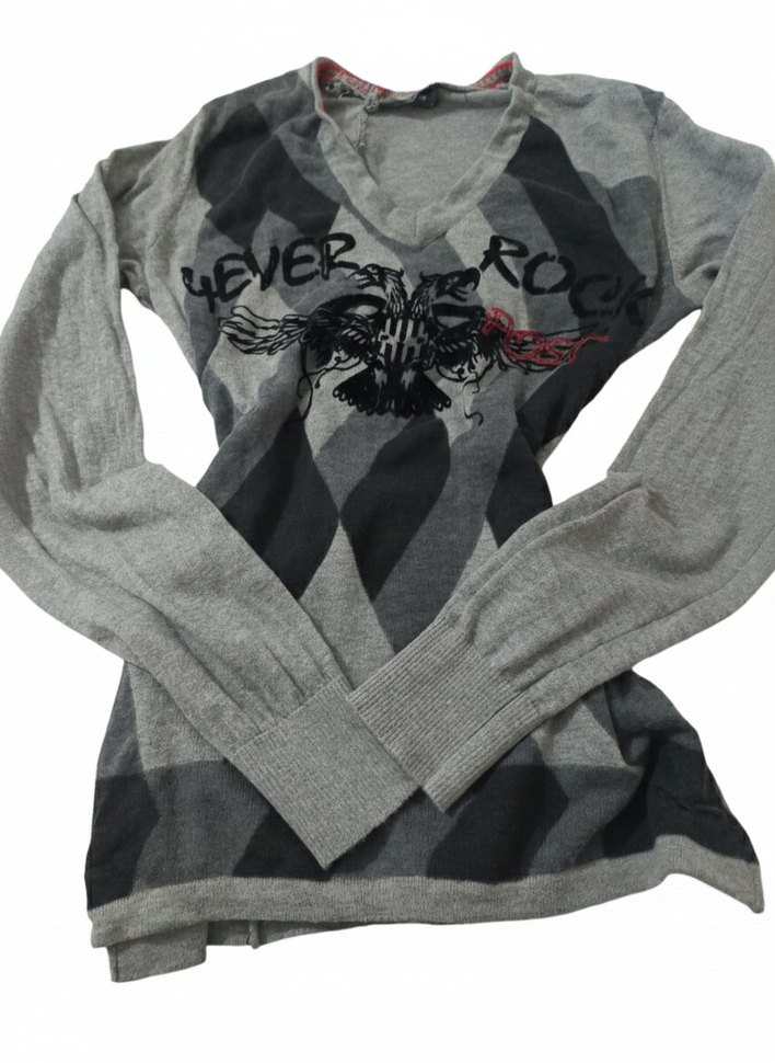Gri renkli, V yaka ve uzun kollu örme kumaştan yapılmış, desenli ve bol kesim rock punk tarzı kazak. Normal boyda ve tekstil malzemeden üretilmiştir.