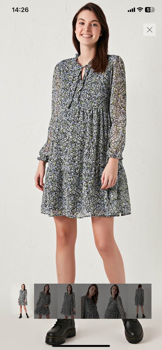 Gri renkte, V yakalı ve uzun kollu midi elbise. Salaş kesim ve fırfır detayları ile yumuşak sentetik kumaştan üretilmiştir.