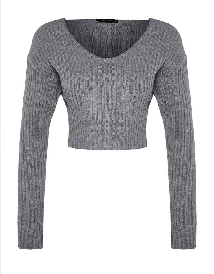Gri V Yaka Uzun Kollu Triko Kadın Kazak
