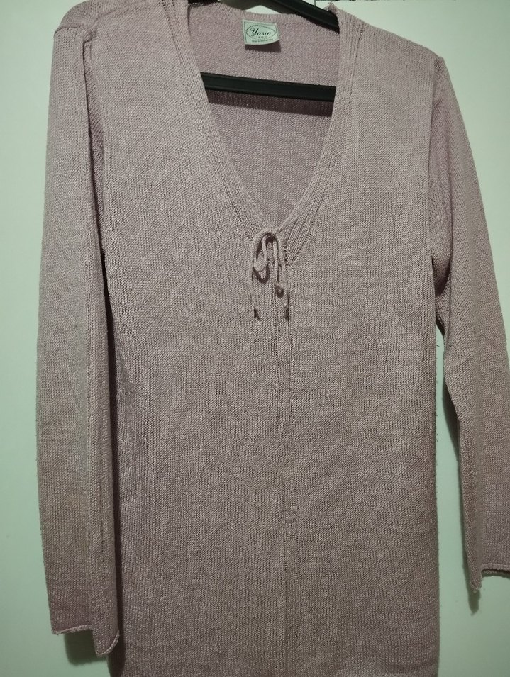 Gri renkli, V yaka ve bağcık detaylı, uzun kollu triko kadın kazak. Gevşek kesim ve normal boyda, günlük kullanıma uygun.