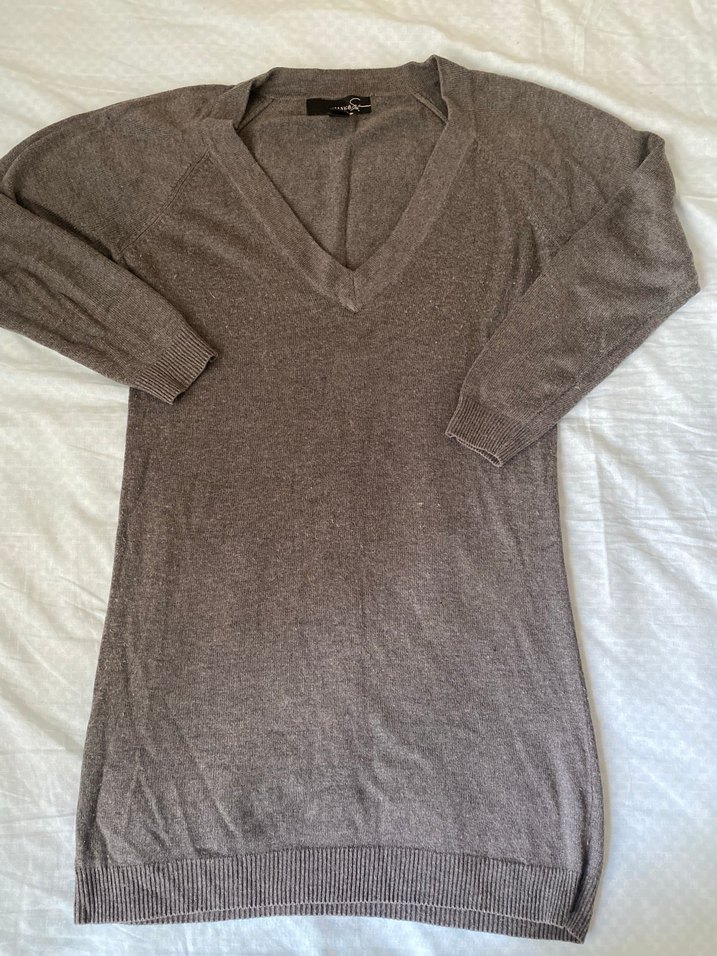 Gri renkli, V yaka ve uzun kollu triko kadın kazak tunik. Yumuşak kumaştan, gevşek kesim ve desensiz tasarım, günlük rahat kullanım için uygundur.
