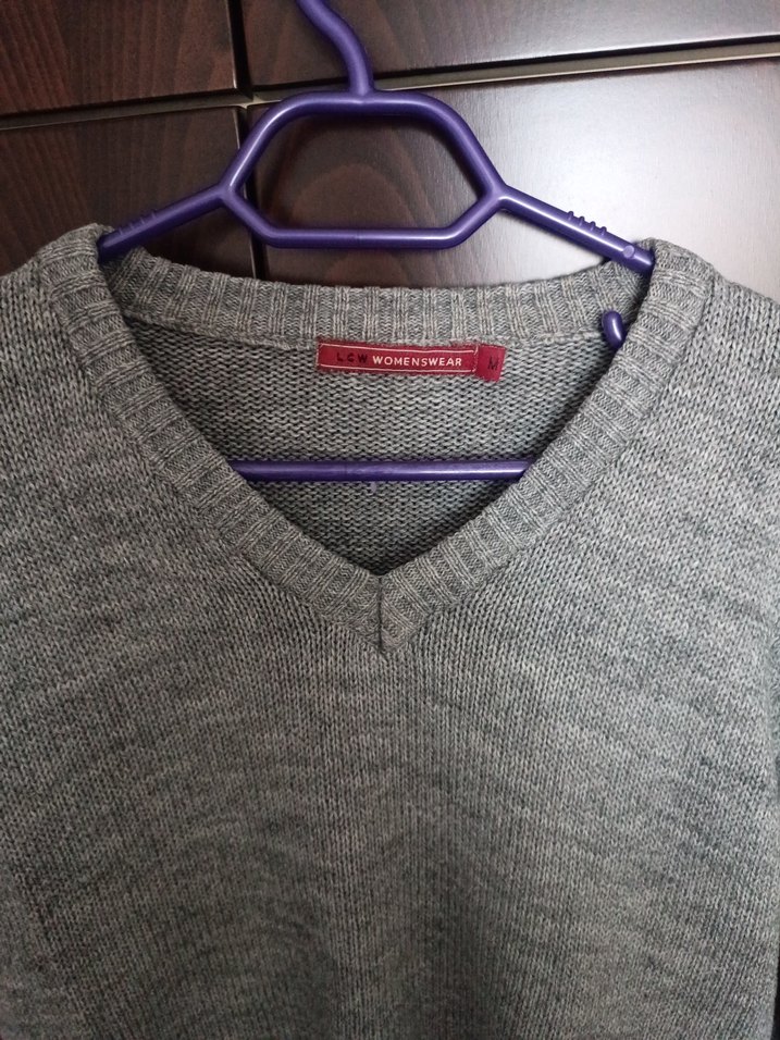 Gri renkte, V yakalı yün kazak. Örgü dokusu ve uzun kollu, rahat kesimle günlük kullanıma uygundur.