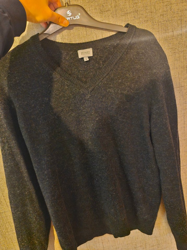 Gri renkli, v yaka ve uzun kollu erkek kazak, Beymen marka L beden.