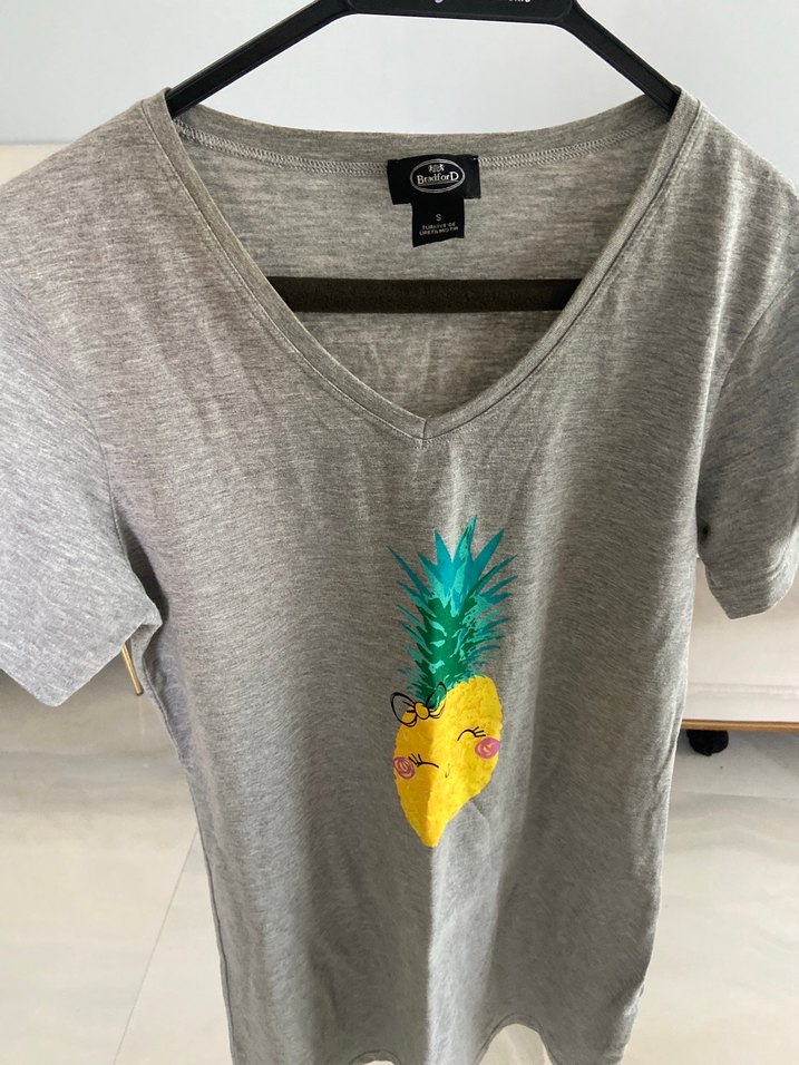 Pamuk gri V yakalı, kısa kollu, bol kesim kadın tişörtü. Üzerinde ananas baskısı ve düğme detayları bulunur, günlük sokak stiline uygundur.