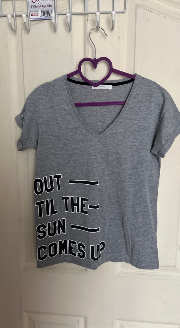 Gri renkte, kısa kollu ve V yakalı, baskılı sloganlı bol kesim kadın tişörtü. Pamuklu yumuşak kumaştan, rahat sokak stili için uygundur.