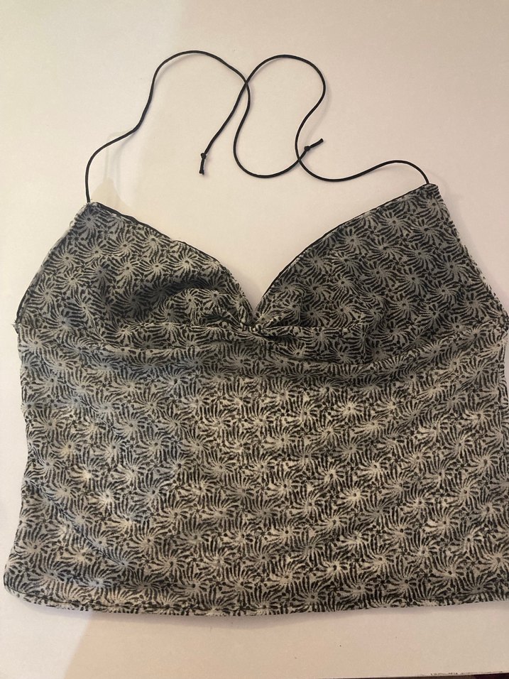 Gri tie-dye desenli, V yakalı ve ince askılı dantel detaylı, normal boyda fitted büstiyer. Yumuşak sentetik kumaştan, günlük kullanıma uygun. ✨ #y2k
