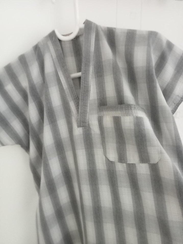 Gri tonlarda, düğmeli V yakalı, kısa kollu, bol kesim erkek pijama. Minimalist görünüm için ön cepli ve ince kare desenli.