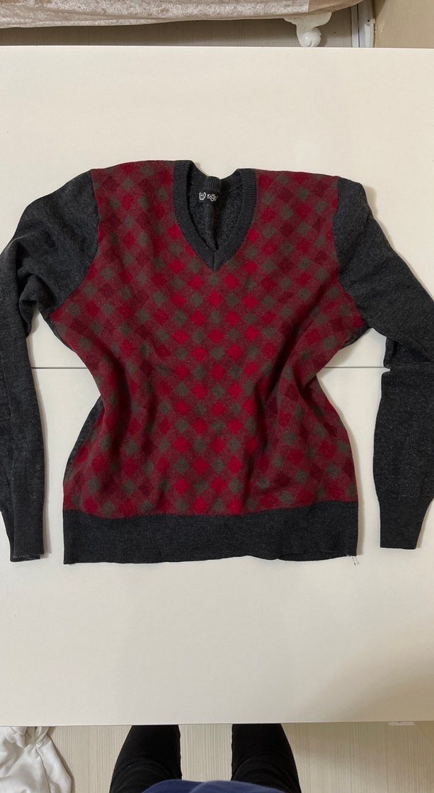 Bu erkek kazak, V yakalı ve uzun kolludur, yumuşak yünden örülmüştür. Ön kısmında kırmızı ve gri kare desen bulunur, rahat ve salaş kesimdir.