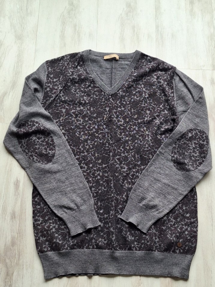 Gri renkli, V yakalı ve uzun kollu örme kazak. Dirseklerde detaylı, rahat kesim ve günlük kullanıma uygun sokak stili kazak.