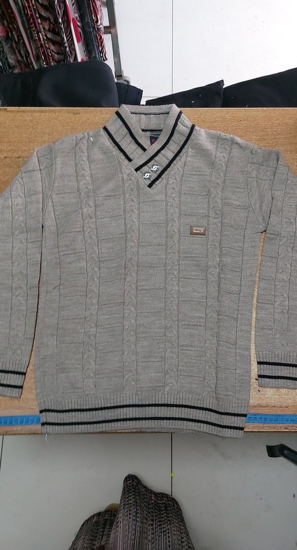 Gri renkli, V yakalı, uzun kollu örme erkek kazak. çizgili detaylara sahip, günlük kullanıma uygun rahat stil.