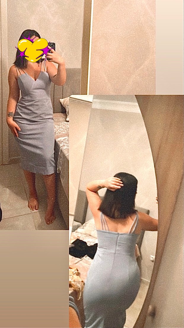 V yakalı, ince askılı, gri midi kalem elbise. İpeksi kumaştan, yırtmaçlı ve vücuda oturan kesime sahip, parti için uygun.
