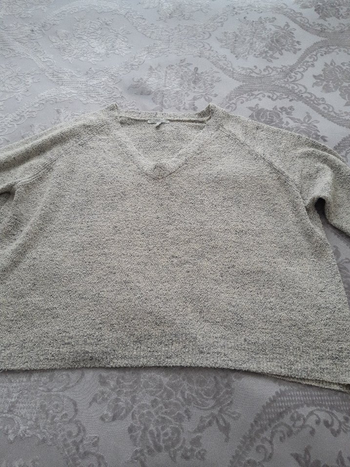 Gri renkli, V yakalı, kadın kazak. Salaş kesimli, uzun kollu ve desensiz, normal midi boyunda rahat bir basic modeldir.