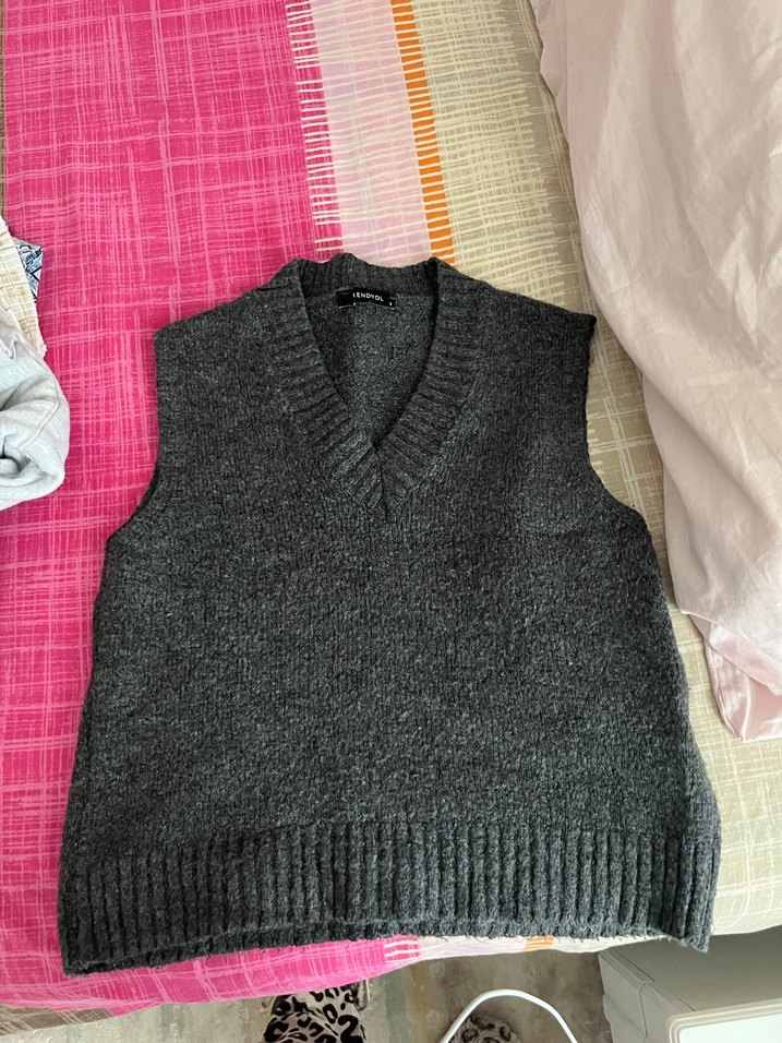 Gri renkte, V yakalı ve kolsuz, örgü yün kadın yelek. Rahat kesimli ve normal boyda, günlük kullanıma uygun.