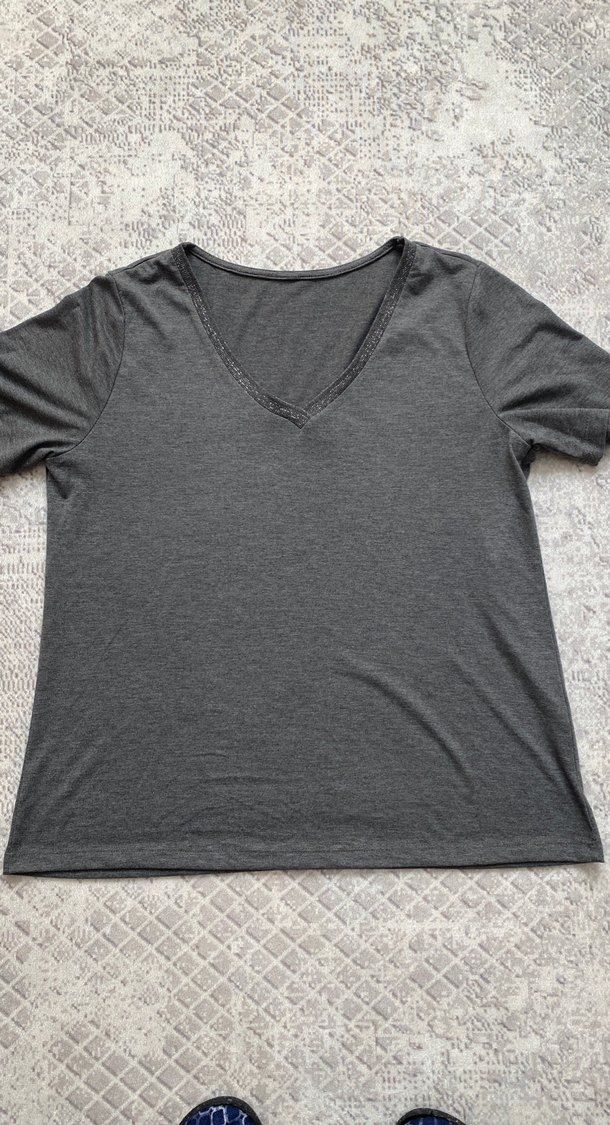 Renk : Gri Beden :XL Yaka: V yaka simli Kısa kolu İnce hafif kumaş Defosu yok temiz ürün 1 defa giydim Tişört boyu :66cm Tişört genişliği:54cm