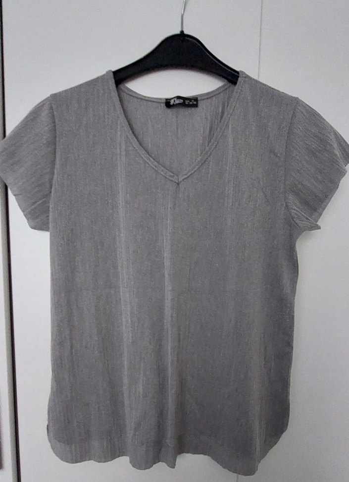 Gri renkli, V yakalı ve kısa kollu, bol kesim kadın tişörtü. Pliseli dokusu ile günlük sokak stiline uygun rahat bir modeldir.