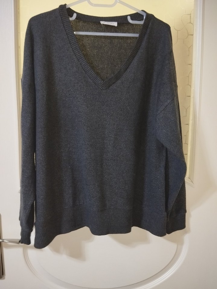 Gri renginde, V yakalı ve uzun kollu bu kadın kazak, rahat kesimi ve triko dokusuyla günlük kullanıma uygundur. Midi uzunlukta ve keten kumaştandır.