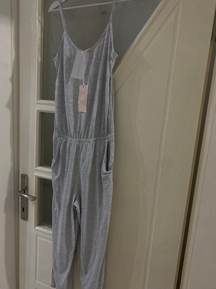 Gri renkli, V yakalı ve kolsuz kadın tulumu, rahat kesimi ve midi boyuyla günlük kullanıma uygundur. Yumuşak sentetik kumaştan üretilmiş, yan ceplidir. Hafif kaprimsi tarz
