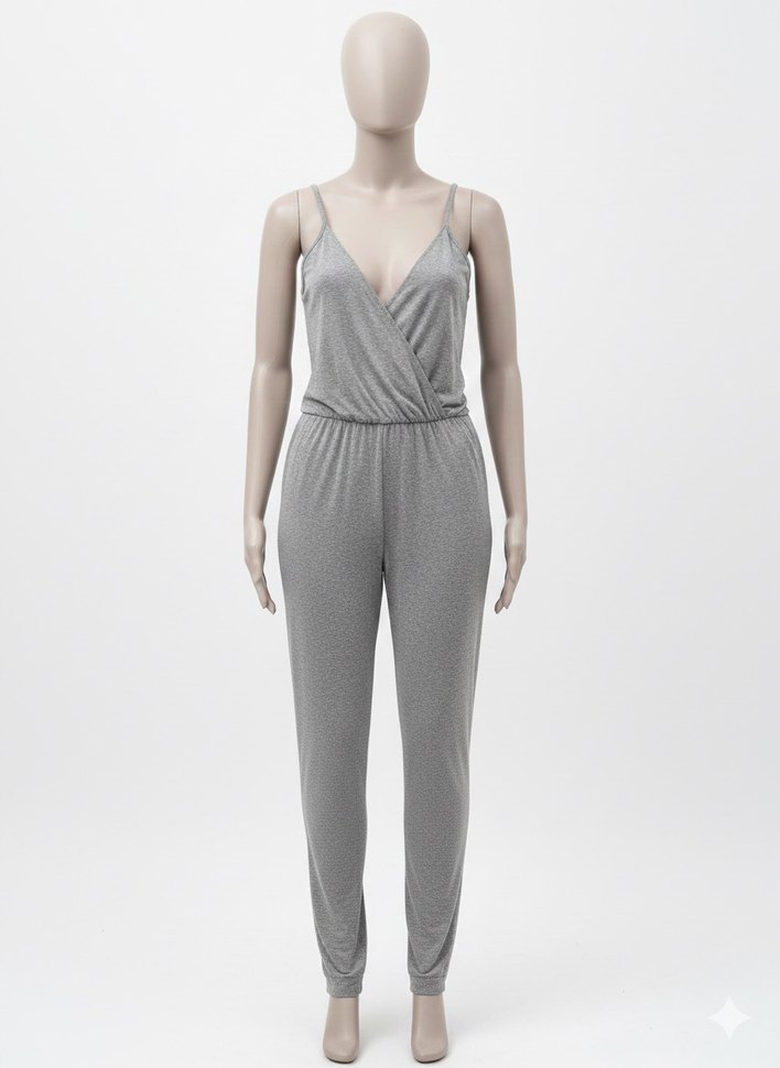 Gri renkte, V yakalı ve askılı kadın uzun tulum. Rahat kesim ve günlük kullanıma uygundur. Modern ve şık tasarıma sahiptir. Esnek kumaştan.