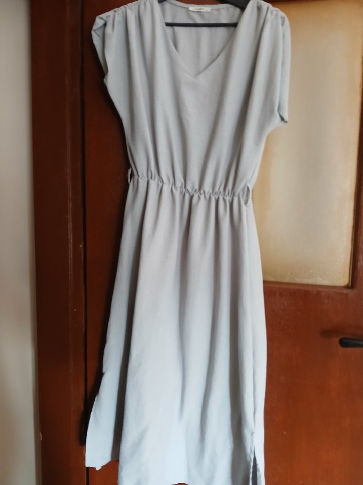 Gri keten kumaştan, V yakalı ve kolsuz uzun salaş elbise. Drapeli tasarımı ve minimalist tarzıyla günlük rahat kullanım için uygundur.