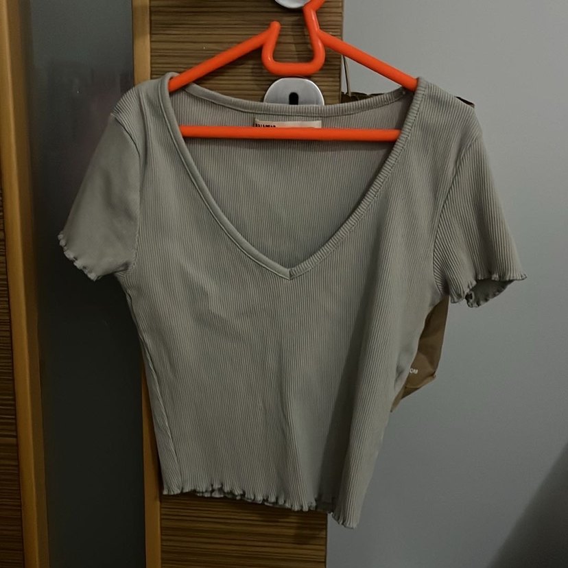 Gri renkli, V yakalı ve kısa kollu kadın tişörtü, düz ve sıkı kesimdir. Sentetik kumaştan yapılmış, kısa boyda ve günlük sokak modasına uygundur.