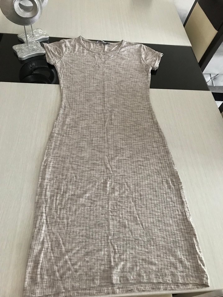 Gri sentetik kumaştan, kısa kollu, V yakalı ve pileli detaylı, vücuda oturan uzun elbise.Kusuru var fotoğrafladım alıcısının bilgisine