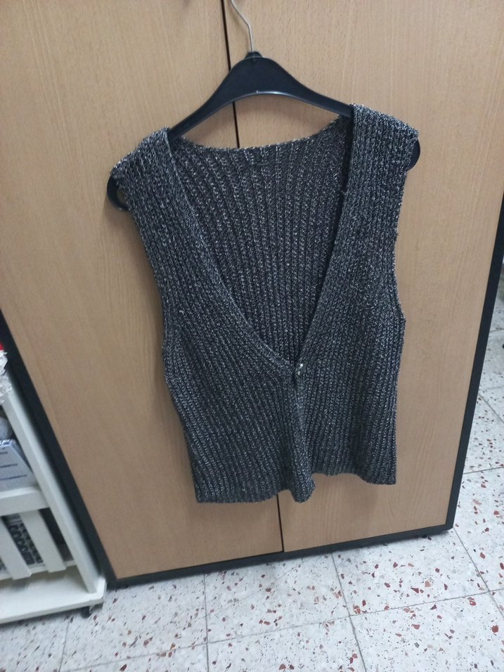 Gri renkli, V yakalı ve kolsuz, triko dokuma kısa ve dar kesim kadın yelek. Rahat ve gündelik kullanıma uygun.