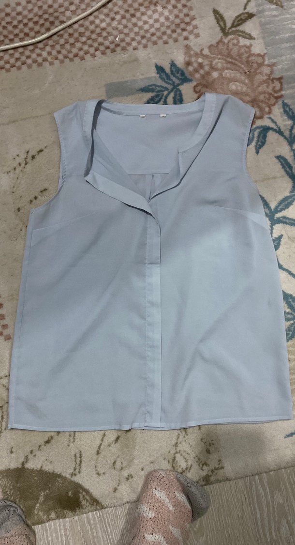 Kolsuz, V yakalı ve düğmeli ön kısmı olan, nefes alabilen keten kumaştan yapılmış, bol kesim gri bluz. Minimal ve günlük kullanım için uygundur.