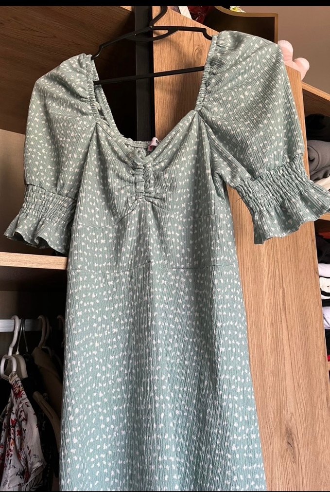 Gri renkte, V yakalı, kısa kollu ve fırfır detaylı midi boy bol kesim elbise. Yumuşak keten kumaştan, rahat ve bohem tarzda günlük kullanım için uygundur.