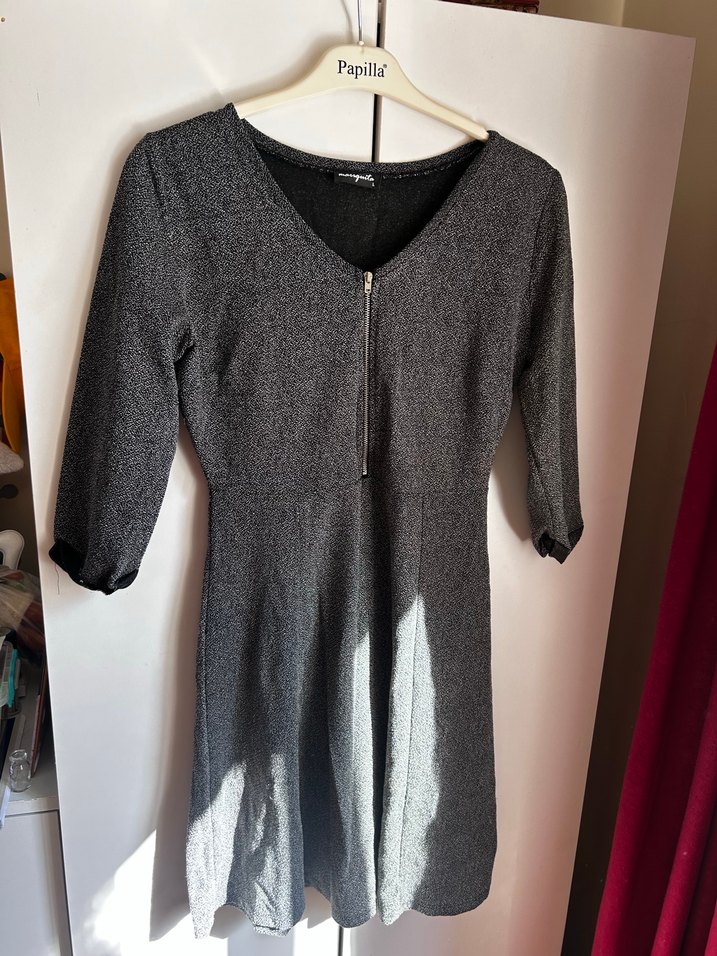 Gri renkli, V yakalı ve uzun kollu midi elbise. Önden fermuarlı, vücuda oturan kesime sahip, düz desensiz ve sentetik kumaştan yapılmıştır. Minimalist tarzda, günlük kullanım için uygundur.
