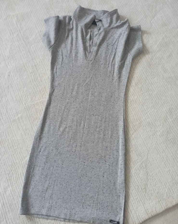 Gri renkte, kısa kollu ve V yakalı, vücuda oturan midi boy kadın elbise. Yumuşak sentetik kumaştan, günlük sokak stili için uygun.