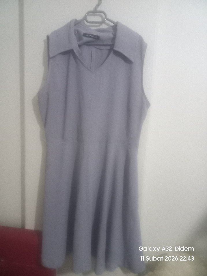 Gri renkte, V yakalı ve kolsuz midi elbise. Sentetik kumaştan, rahat kesim ve günlük sokak stiliyle uyumlu.