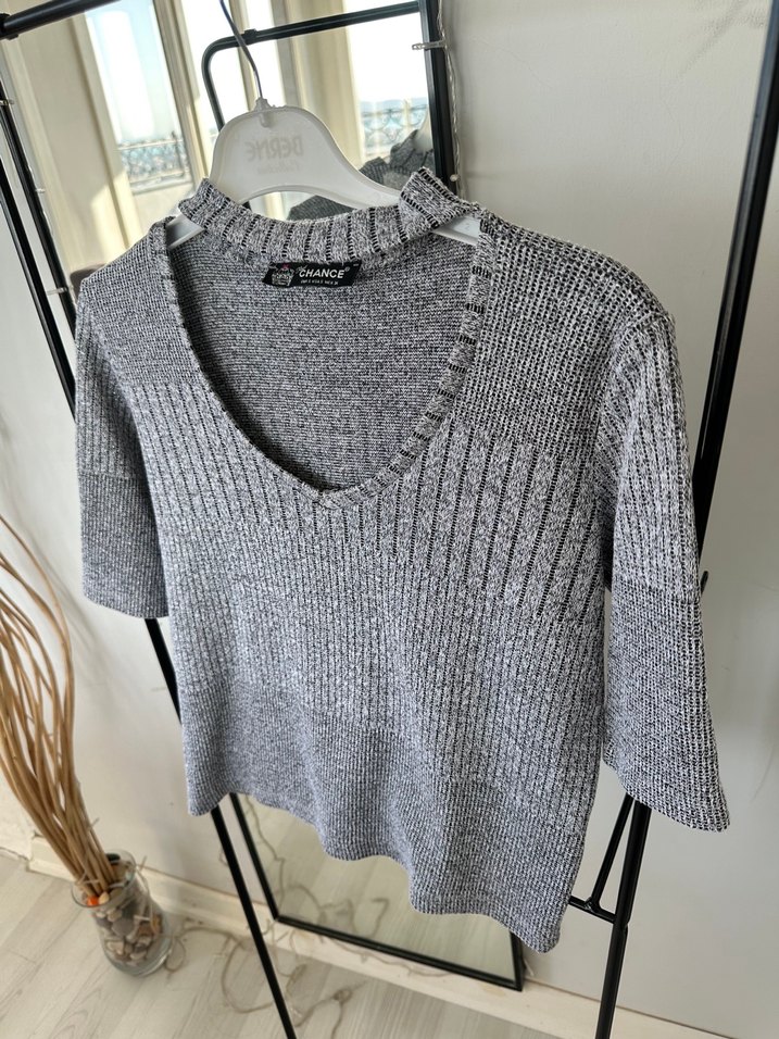 Gri V Yakalı Örgü Kadın Bluz