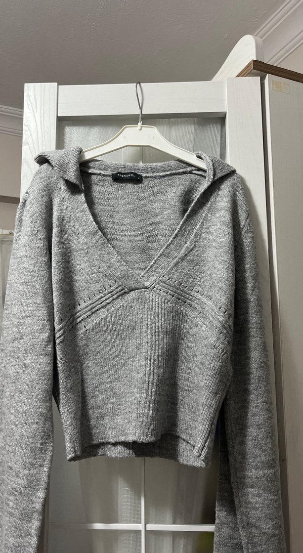 Gri renkli, V yakalı ve uzun kollu örgü kadın kazak. Normal midi uzunlukta, rahat kesim ve desensiz tasarıma sahiptir.