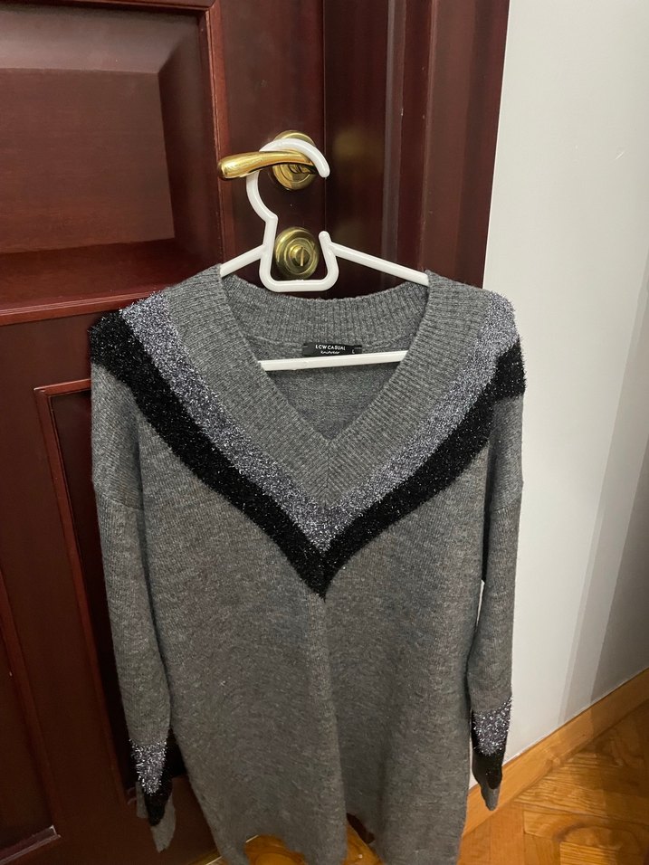 Gri renk, V yakalı, uzun kollu örgü kadın kazak. Rahat kesimi ve sade tasarımıyla günlük kullanıma uygundur.