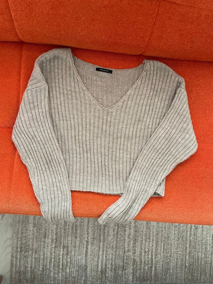 Gri renkli, V yakalı örgü kadın kazak, yumuşak yünden, uzun kollu ve bol kesim. Günlük rahat kullanıma uygundur.