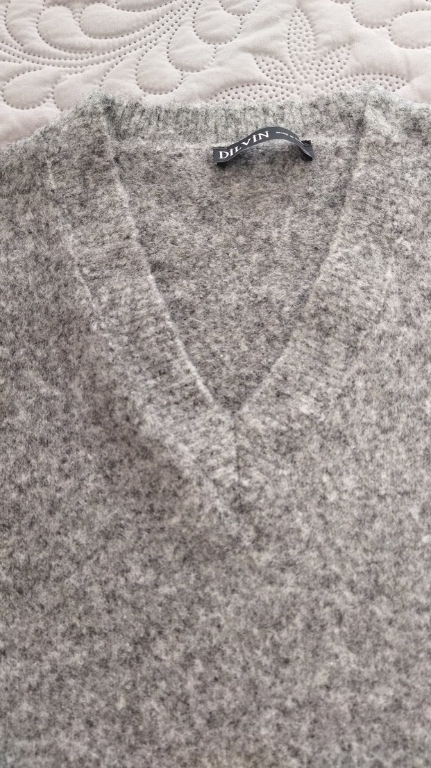 Gri renkte, V yakalı ve uzun kollu, yün örgü kadın kazak. Rahat kesimi ve normal boyuyla günlük kullanıma uygundur.