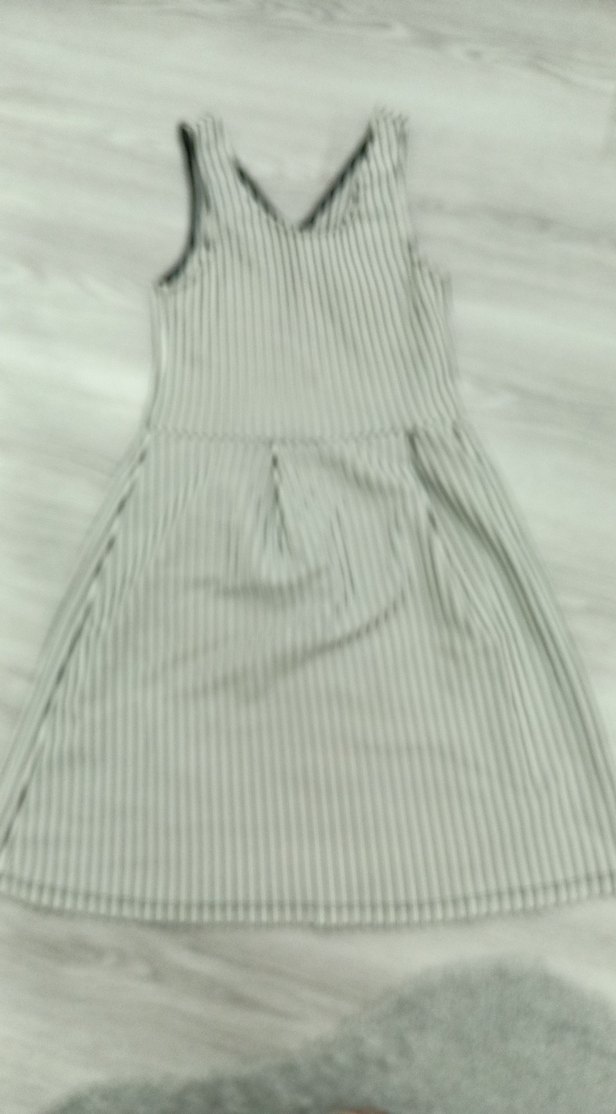 V yakalı, kolsuz piliseli midi elbise, yumuşak sentetik kumaştan yapılmıştır. Gri renkte ve günlük kullanım için uygundur.