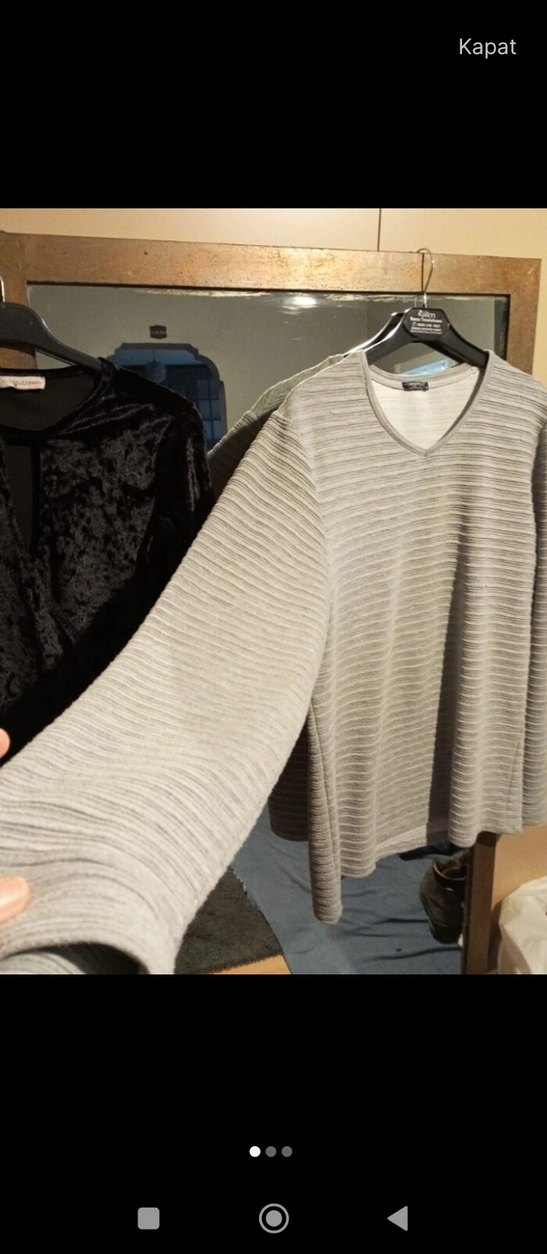 Gri renk, V yakalı, uzun kollu ve pliseli dokulu keten kumaştan yapılmış bol kesim kazak. Rahat günlük kullanım için uygundur.