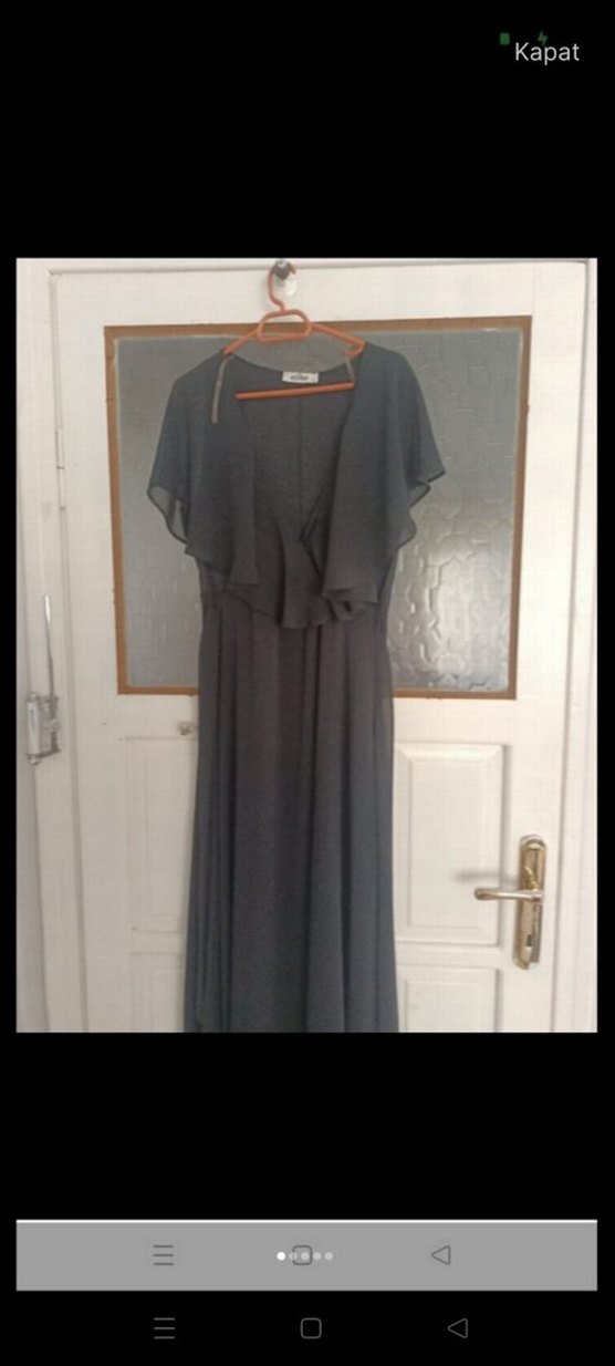 Gri renkte, v yaka ve kolsuz uzun elbise. Salaş kesim ve drapeli detaylarla minimalist ve rahat bir tarz sunar, düğün için uygundur.