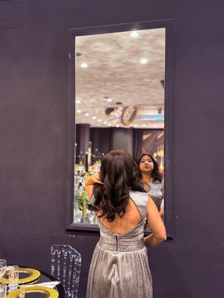 V yakalı, kolsuz, transparan detaylı ve baskılı desenli gri midi boy abiye elbise, düğünler için uygun. İnternette 1900₺ 1 kez giydim dekoltesini diktim açabilirsiniz